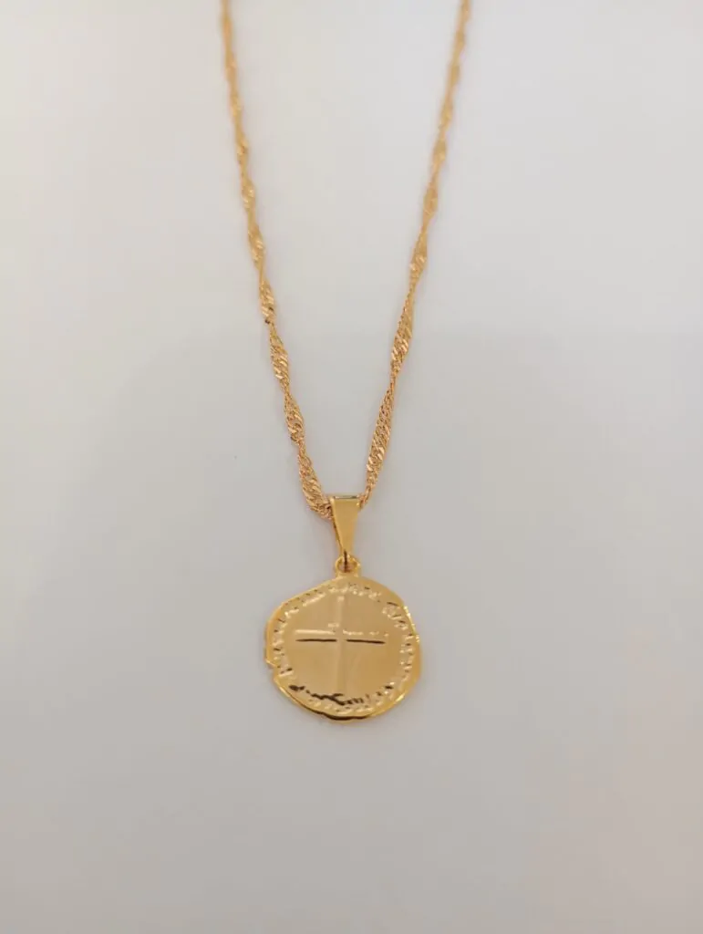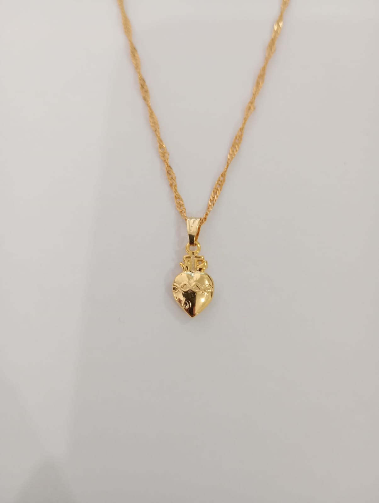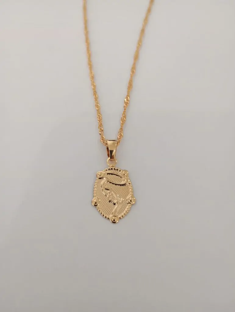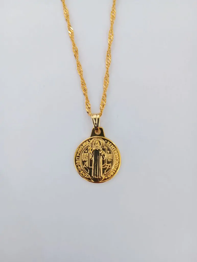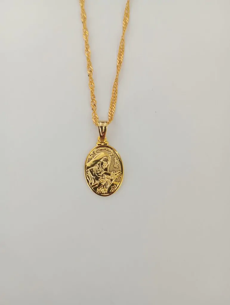 Pingente feito em latão, dupla face, galvanizado a ouro, estampado e corrente tipo cingapura com base de latão galvanizado a ouro, fecho tipo mosquetão