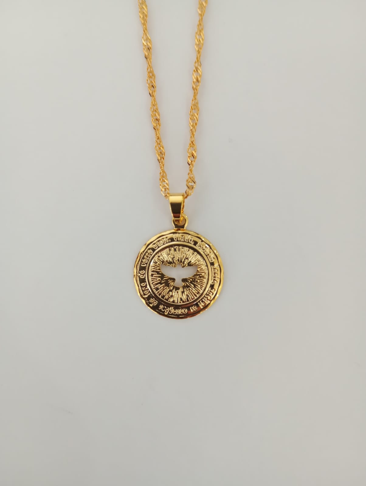 Pingente feito em latão galvanizado a ouro, estampado e vazado com corrente tipo cingapura com base de latão galvanizado a ouro, fecho tipo mosquetão